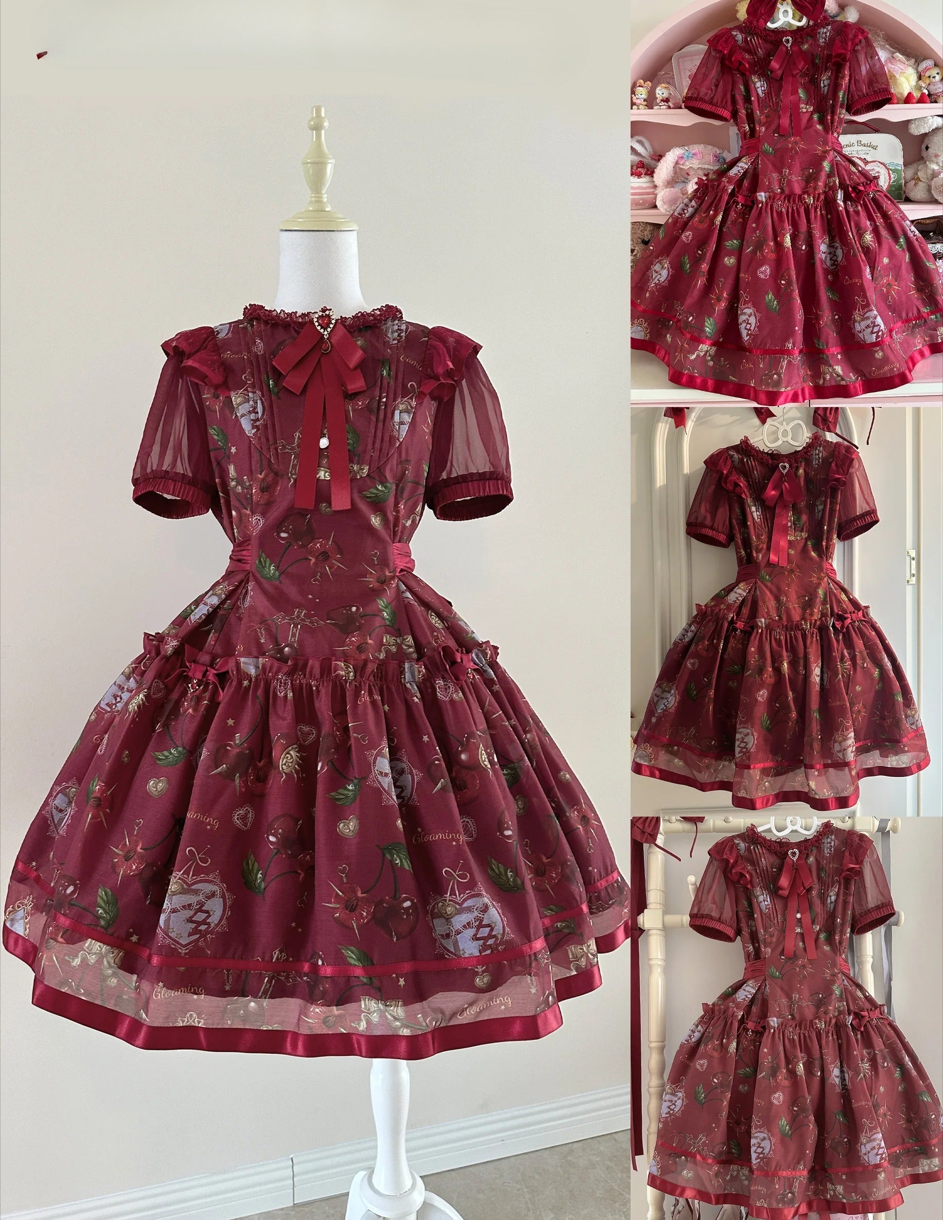 Design Elements: This Lolita dress comes in various colorways, including white, red, gray, and black, each adorned with a cherry-themed print that combines sweetness with a classic touch. The dress is available in both JSK and OP styles, catering to different styling preferences. The bodice features a square neckline framed by delicate lace.