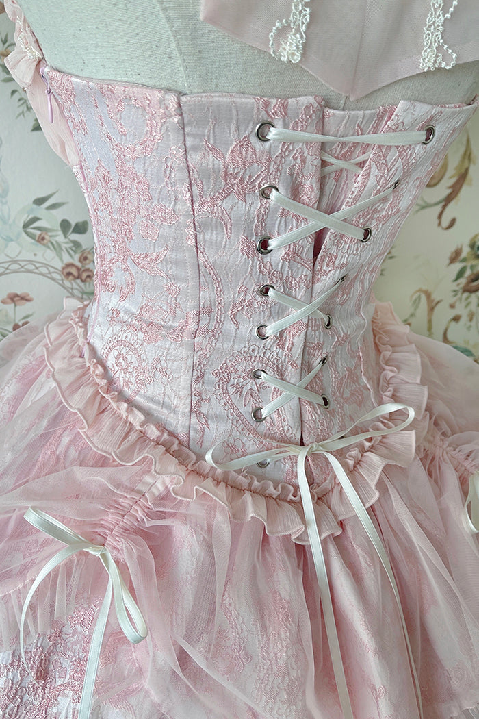 Design Elements: The fitted bodice has a corset-like design. Layered skirt with ruffles: The skirt has multiple layers of organza and lace, giving it volume and a classic lolita silhouette. The ruffled hem and gathered layers create a full, princess-like shape. Satin bow accents—one at the center of the bodice and two on the sides of the skirt.