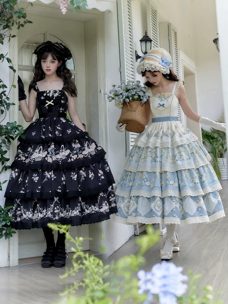 Design Elements: This JSK features a classic pastoral theme with elegant floral embroidery across a tiered skirt. Each layer is adorned with delicate lace trim, creating a refined, vintage look. The wide straps have ruffled edges, and a soft ribbon decorates the bodice, emphasizing a romantic, fairytale aesthetic.