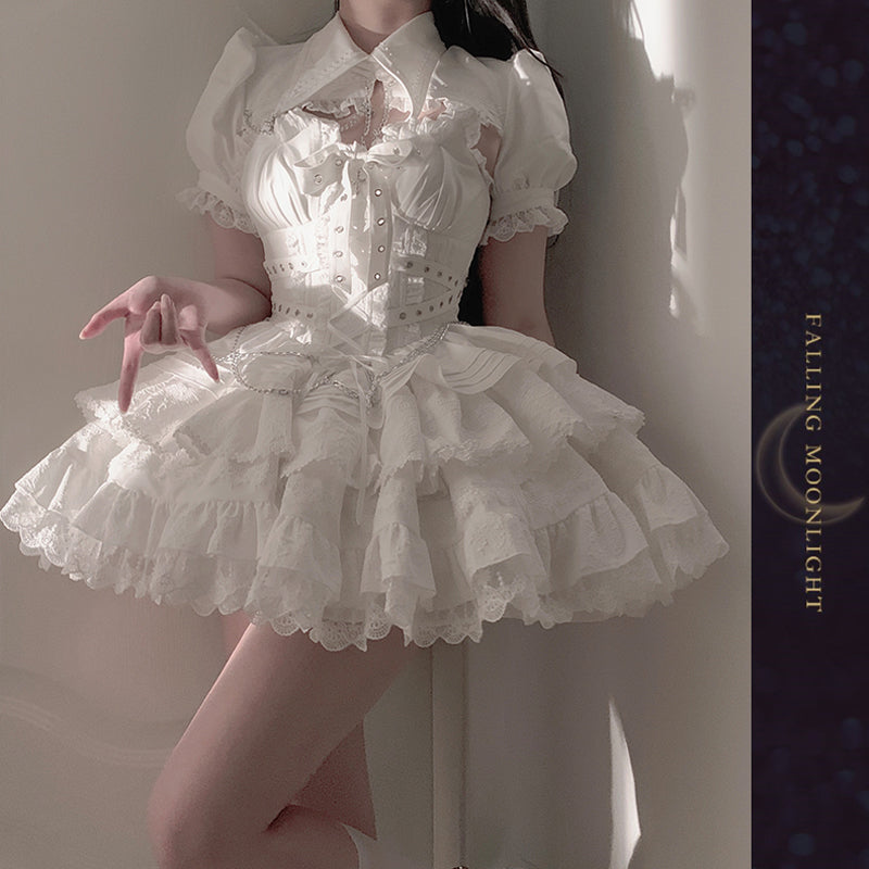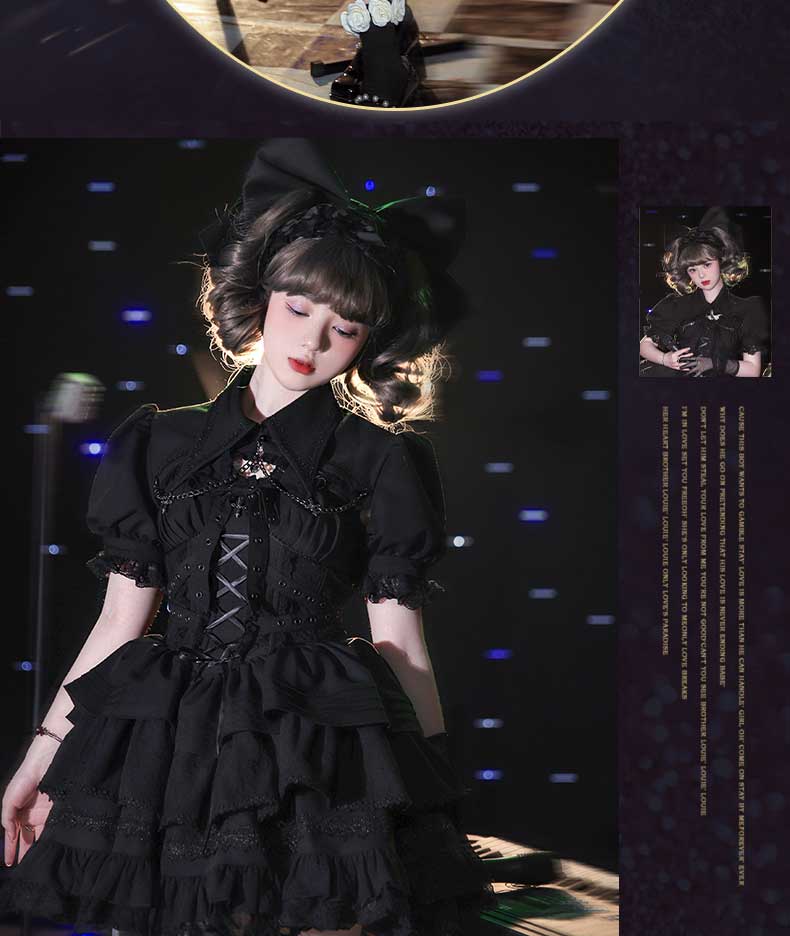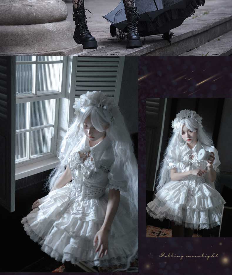 Design Elements: This Lolita JSK features a predominantly black(white) color scheme with intricate detailing. The bodice is structured with a high collar and short sleeves, adorned with lace and ribbon accents. The front of the bodice includes a series of buttons and crisscross ribbon details, adding a Gothic touch. The skirt is multi-layered, with ruffled trims and lace borders, creating a voluminous and elegant silhouette. The overall design exudes a dark, romantic aesthetic typical of Gothic Lolita fashion.