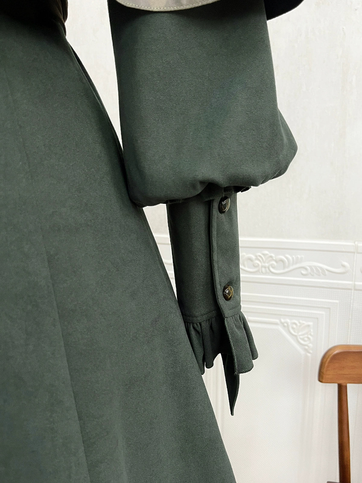 Design Elements: This enchanting medieval - inspired dress showcases a harmonious blend of rustic charm and elegant details. The long - sleeved bodice is crafted from a rich, deep - green fabric, exuding a sense of earthy sophistication. A hooded capelet, featuring a gradient feather - like pattern, drapes gracefully over the shoulders, adding a mystical flair. The waist is accentuated by a wide, brown belt with an ornate metal ring, cinching the figure beautifully. Delicate floral embroidery adorns the hem, lending a touch of femininity and nature - inspired beauty. The overall silhouette is flowing and romantic, perfect for those who appreciate a fairy - tale aesthetic.
