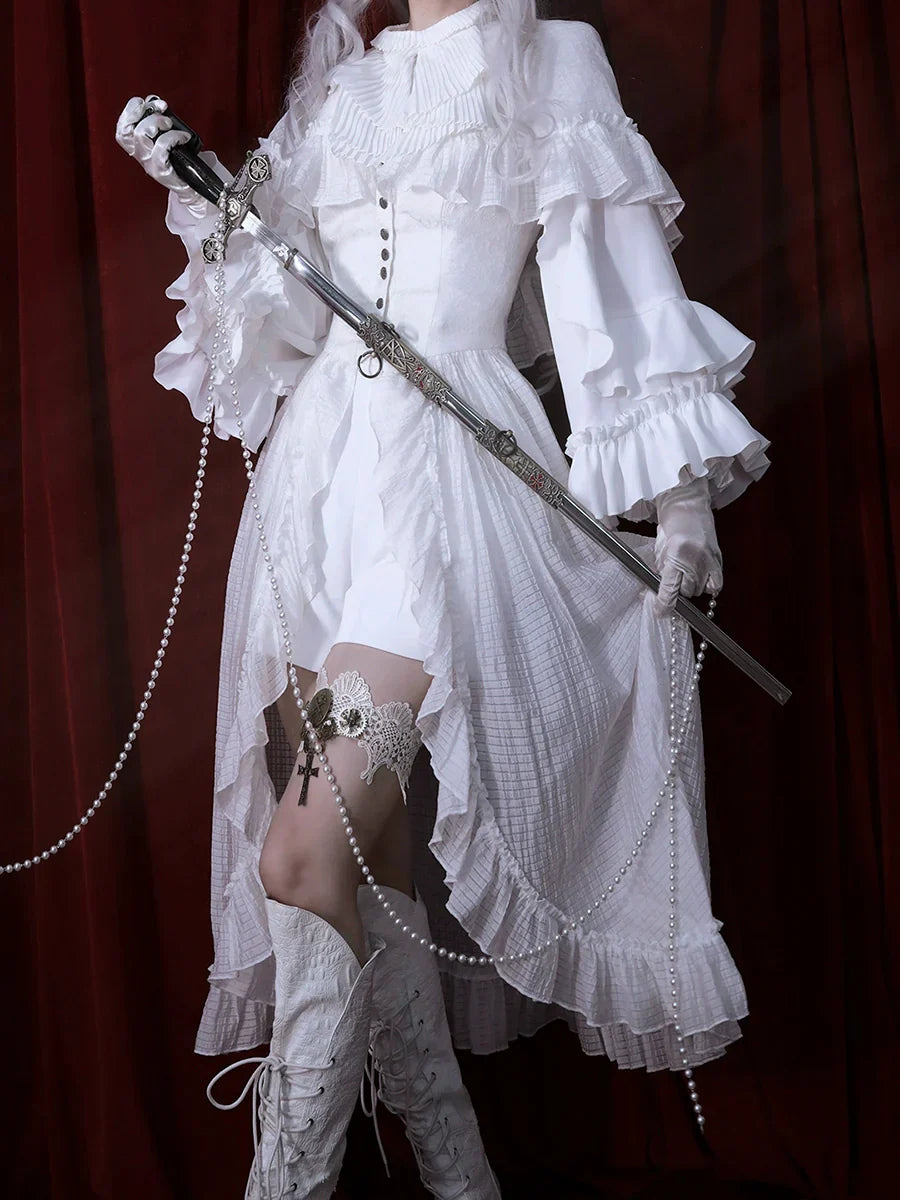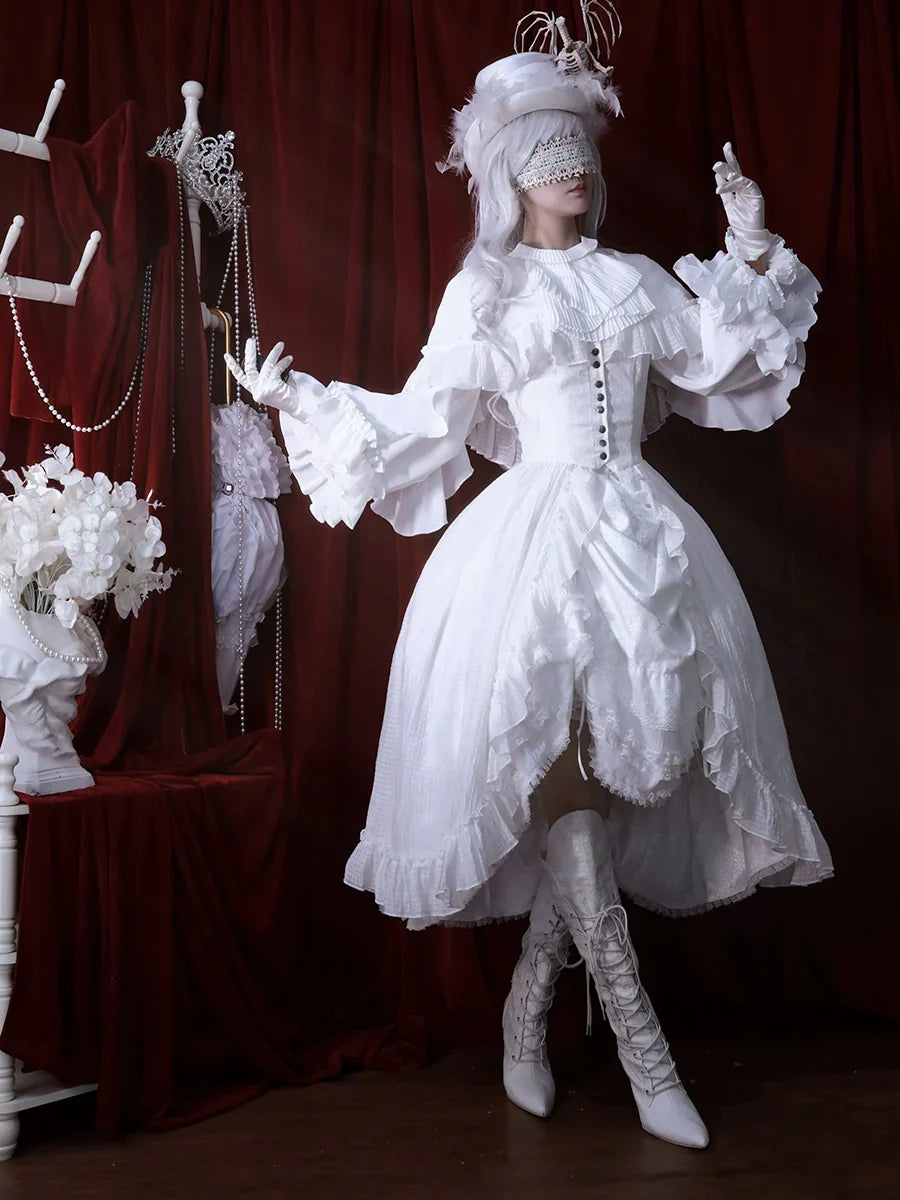Details: The design includes a fitted vest with delicate buttons and ruffled trims that flow into a long, hooded skirt. The cape adds a dramatic touch, with its gentle draping and soft ruffles enhancing the whimsical, fairy-tale aesthetic.