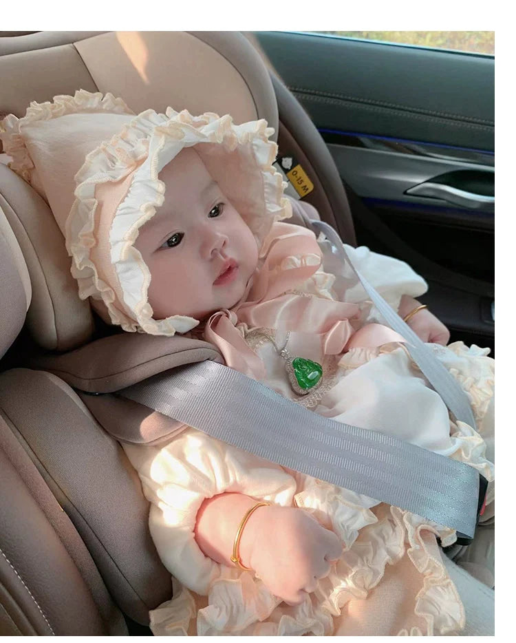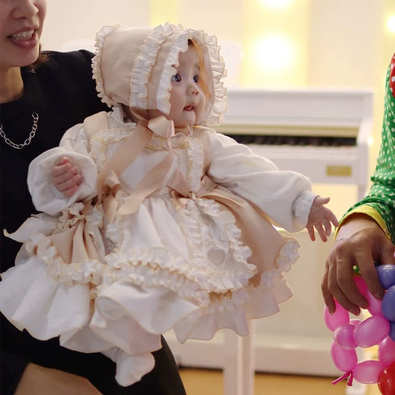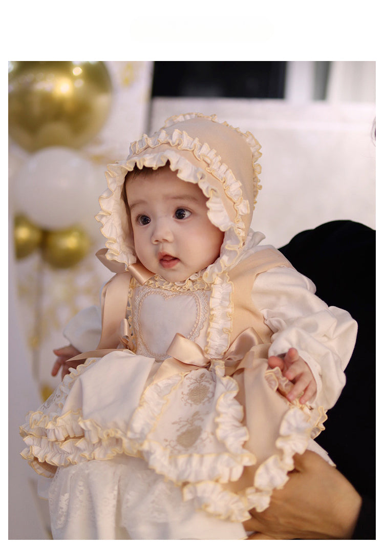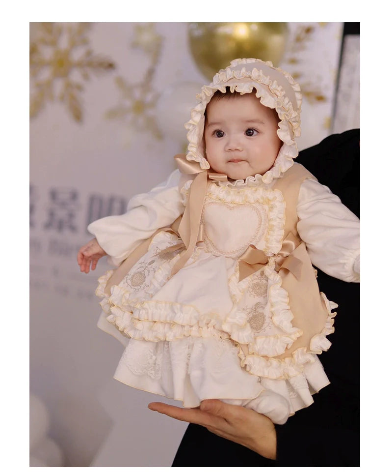 Details: The multi-tiered skirt is bordered with intricate lace and ruffled trims, adding volume and elegance. Heart-shaped patterns and embroidery are highlighted throughout, bringing a whimsical touch to the design. The fabric is soft yet structured, suitable for all-day wear. Coordinating elements, such as matching bows and accessories, enhance the cohesive aesthetic.