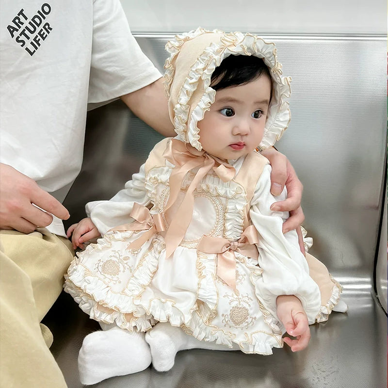 Design Elements: This Lolita dress boasts a delicate pastel color scheme, primarily in peach apricot and white hues. The bodice is embellished with intricate embroidery and heart-shaped accents, creating a romantic and charming look. The neckline and shoulder straps are trimmed with delicate lace and bows, adding a touch of elegance. The skirt is multi-layered, with ruffled edges and a flared silhouette that enhances the overall femininity of the design.