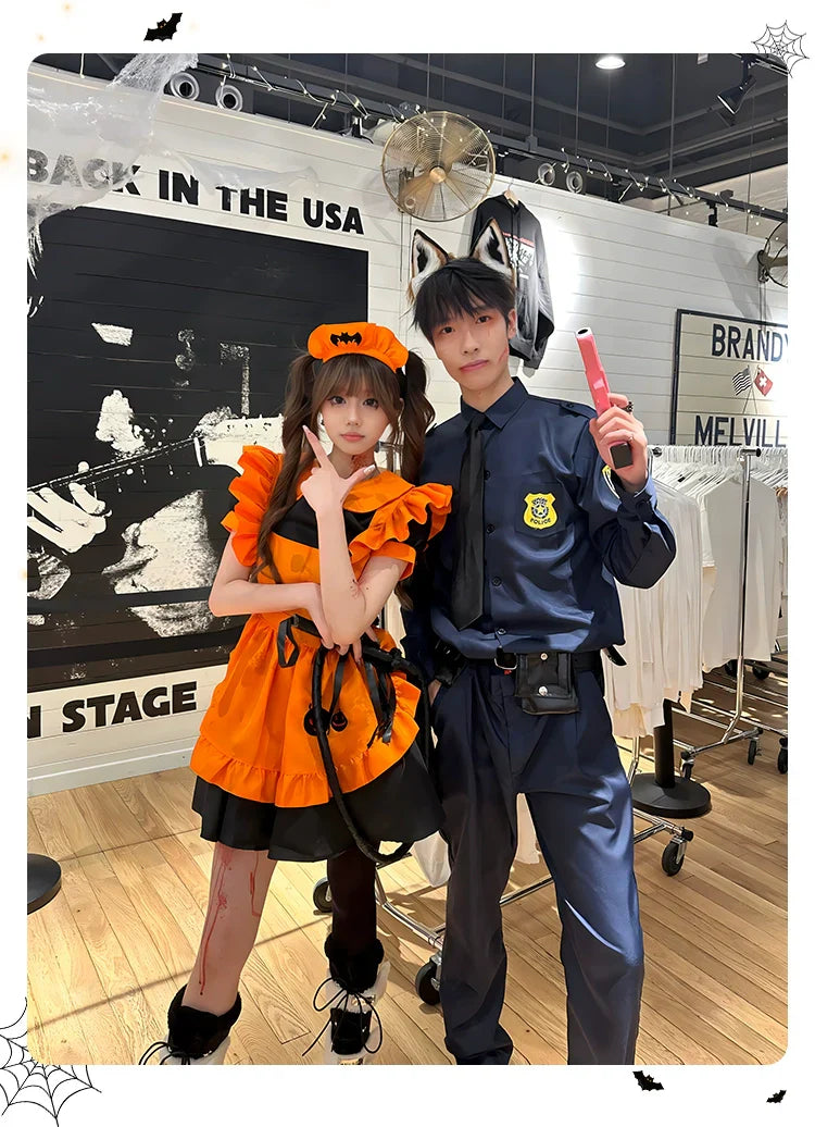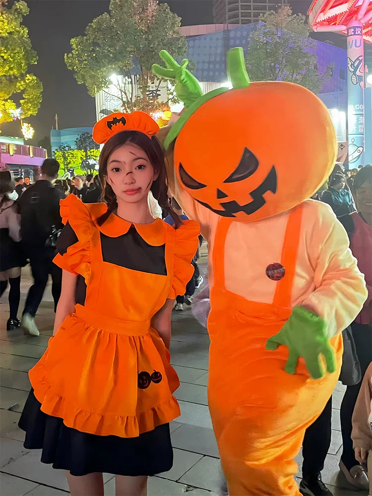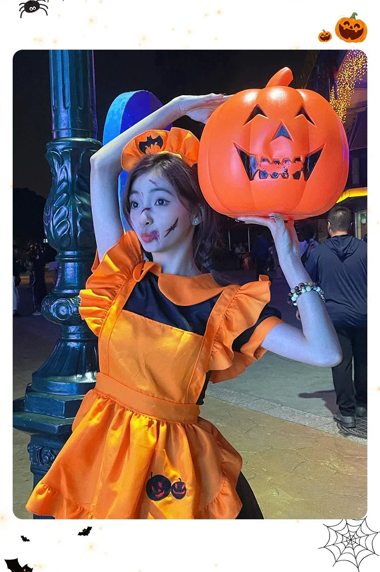Design Elements: This Halloween maid costume features a vibrant orange and black color scheme, perfect for a festive and playful look. The off-the-shoulder style and ruffled layers add a touch of classic Lolita flair