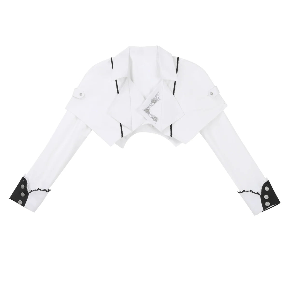 Design Elements: This elegant Gothic Lolita JSK showcases a celestial-inspired design with a striking contrast of crisp white and deep blue hues. The structured bodice features sharp, angular overlays and metallic chain-like embroidery, creating a dramatic architectural silhouette. Delicate ribbon lacing traces down the front, while asymmetrical cape-like panels drape gracefully over the shoulders. A wide, ornate belt cinches the waist, adorned with crescent moon and star motifs. Layered ruffles and sheer overlay fabric add movement and texture to the A-line skirt.