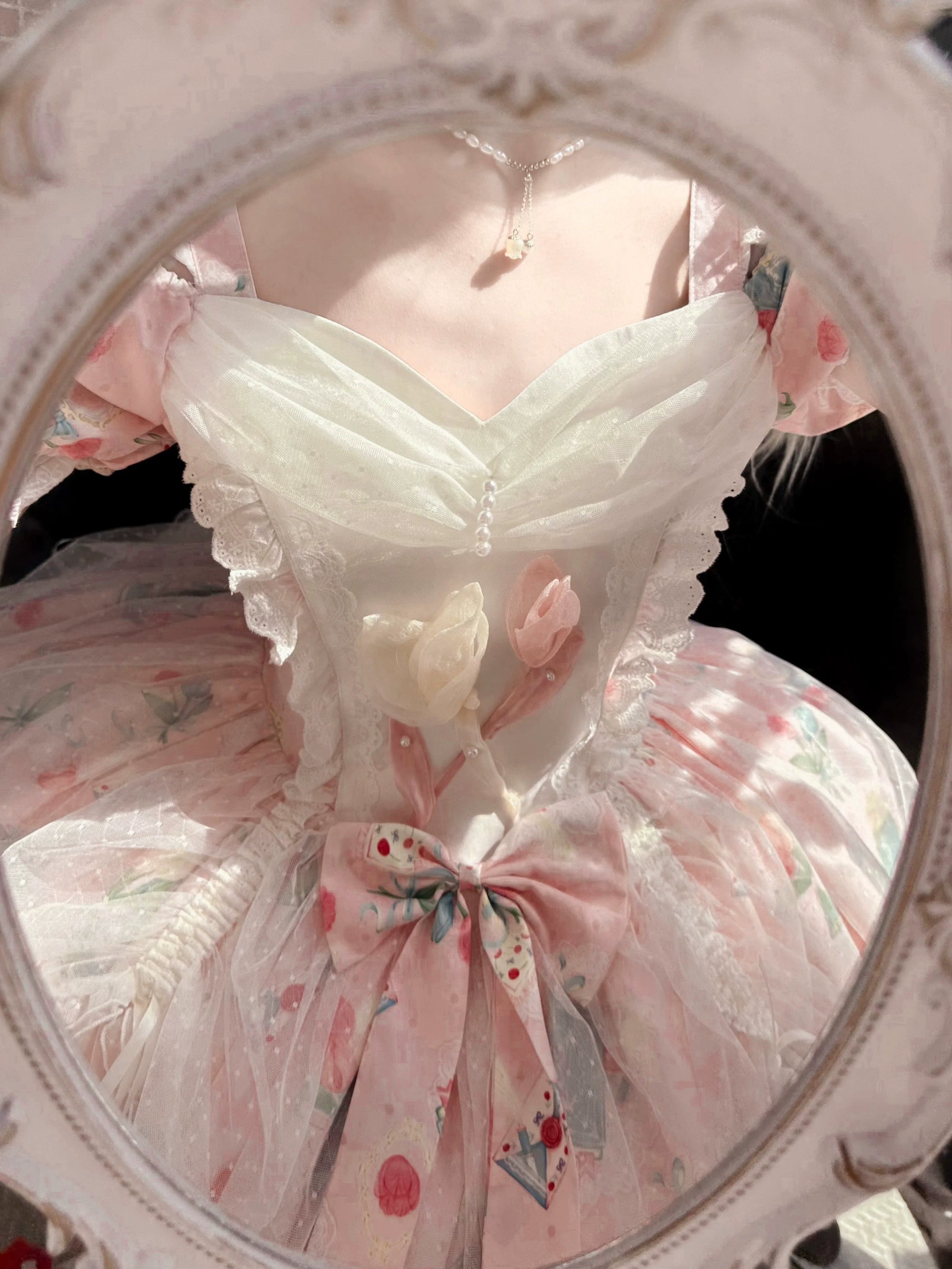 Design Elements: This Lolita JSK showcases a delightful ensemble with intricate lace embellishments and charming ruffled trims framing the neckline and sleeves. Oversized bows cinch the waist and trail along the hem, sculpting a graceful silhouette. Structured bodice and adjustable broad waist ties ensure both refinement and comfort, while the voluminous skirt balances opulence with mobility.