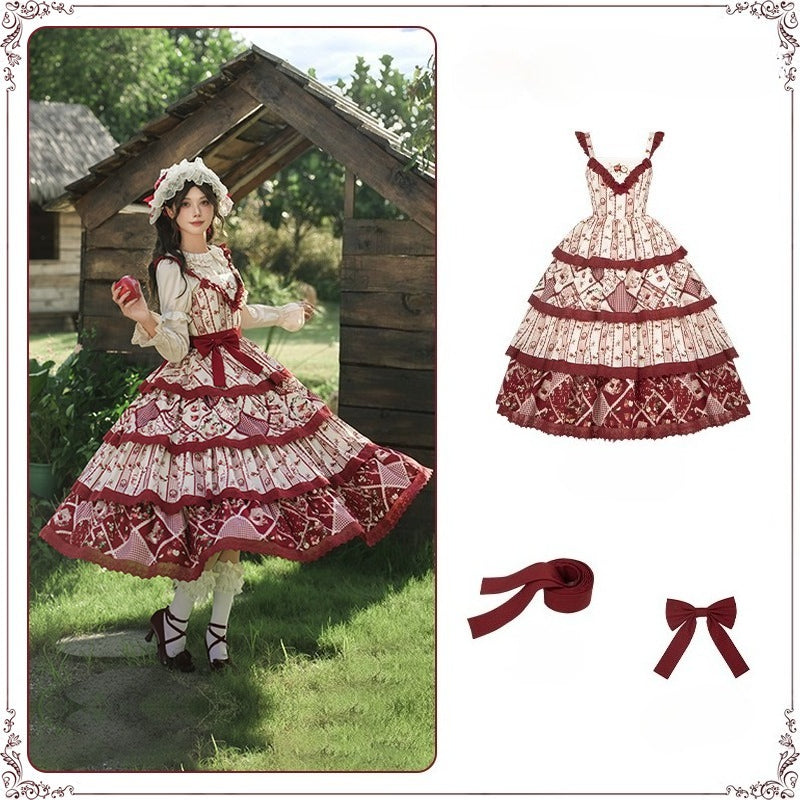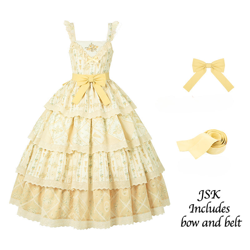 Design Elements: This JSK features a delicate square neckline with lace-edged straps. The bodice is adorned with intricate floral embroidery, enhancing its pastoral charm. A wide bow at the waist highlights the silhouette, flowing into a multi-layered, tiered skirt that adds graceful volume and movement to the piece.