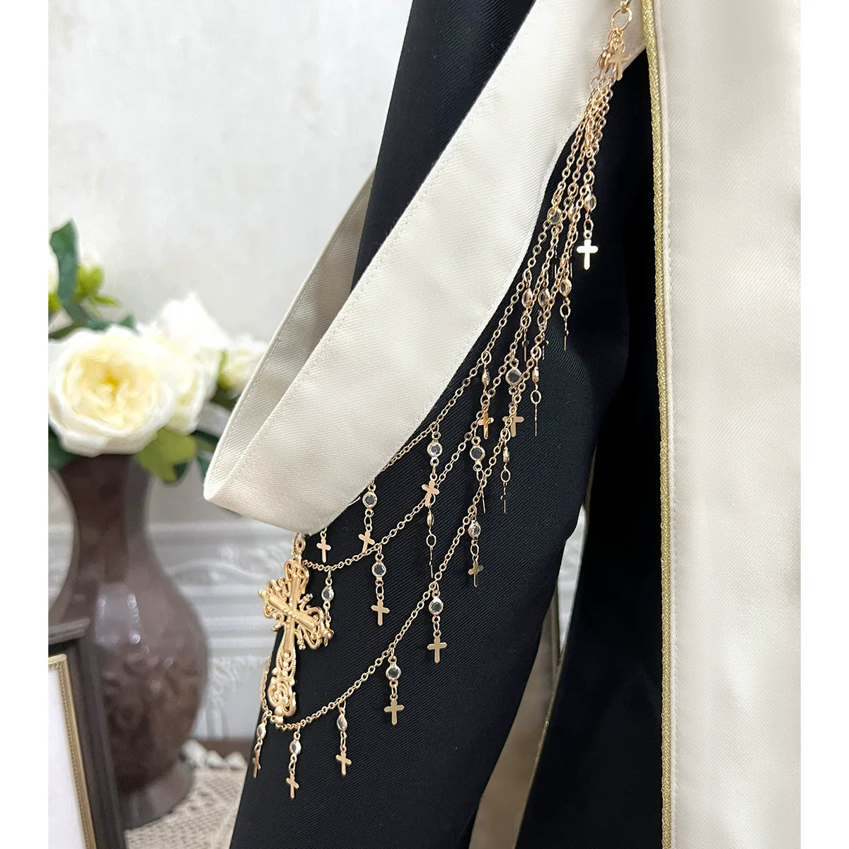 Design Elements: This formal Lolita-inspired ensemble fuses Victorian elegance with gothic accents through its structured tailcoat jacket and high-waisted trousers. The navy bodice showcases gold buttons, contrasting white cuffs, and decorative chains, while dramatic shoulder ribbons and cross-pendant embellishments create a striking silhouette. Layered neckwear combines a crisp ascot with a voluminous cravat, complemented by tailored waist sashes and ornate cane accessories for theatrical refinement.