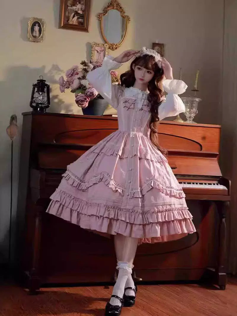 Design Elements: This elegant and sweet Lolita JSK dress features a delicate pink color, perfect for a daily, charming look. The classic Lolita silhouette is emphasized by its layered ruffles and fitted bodice.