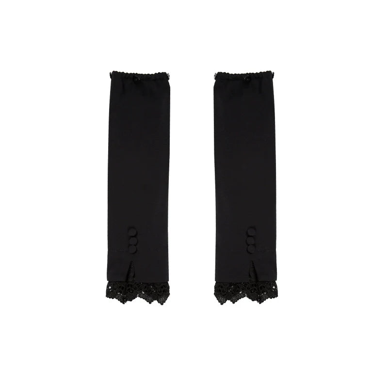 Design Elements: Base & Trim: The dress has a black base with a cream-colored detachable faux collar and cuffs, accented by black ribbon crisscross details and ruffled trims along the neckline and sleeves. Bodice & Silhouette: The structured bodice features adjustable shoulder straps with lace edges, while the multi-tiered skirt flares outward with scalloped lace borders and layered ruffles for added volume. Detachable Components: A detachable bib panel (resembling a "bib" accessory) and attachable sleeves offer versatile styling, aligning with the "multi-wear" concept in the product title. Waist & Accents: Broad waist ties with bow adornments secure the fit, and the hemline is finished with a lace-trimmed flounce to complement the vintage aesthetic.