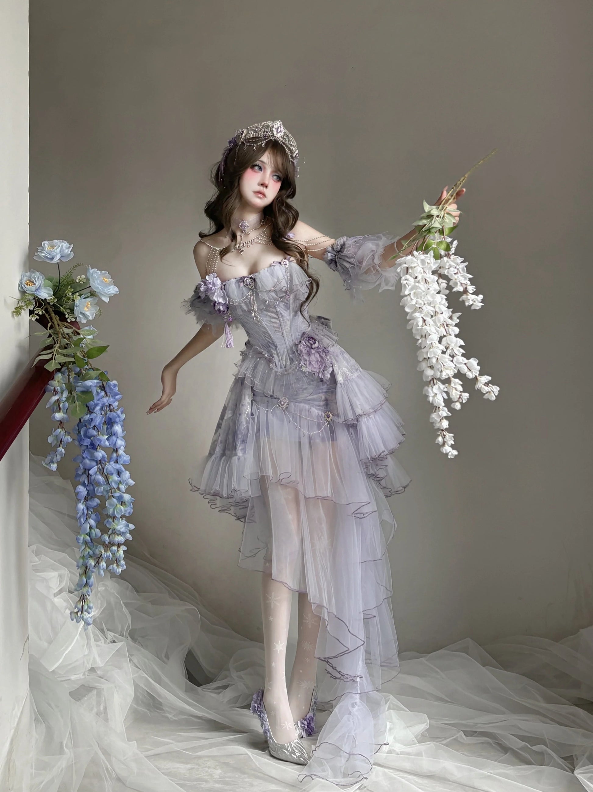 Design Elements: This ethereal Gothic Lolita JSK embodies romantic opulence with its sheer, layered tulle skirt cascading into an asymmetrical hemline. The fitted bodice showcases intricate floral appliqué and delicate lace overlay, accented by off-the-shoulder bell sleeves with flowing chiffon cuffs. A detachable pearl-trimmed capelet adds theatrical drama. Subtle ombre shading transitions from lavender to silver, creating a dreamlike effect.