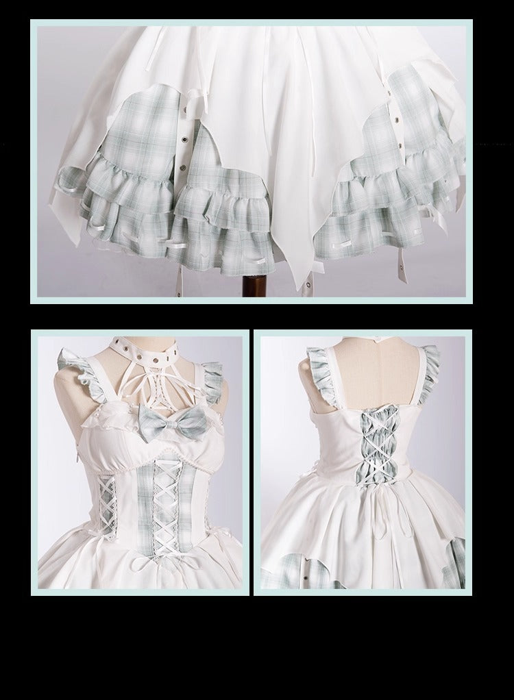 Design Elements: This dress boasts a captivating design. The bodice features a corset - style lacing detail at the front, adding a touch of allure and structure. Straps are adorned with frilly ruffles, enhancing the overall charm. The skirt has an irregular silhouette with multiple layers. The lower part of the skirt showcases a playful combination of solid and plaid fabrics. It is embellished with large bows at strategic points, contributing to a feminine and eye - catching look.