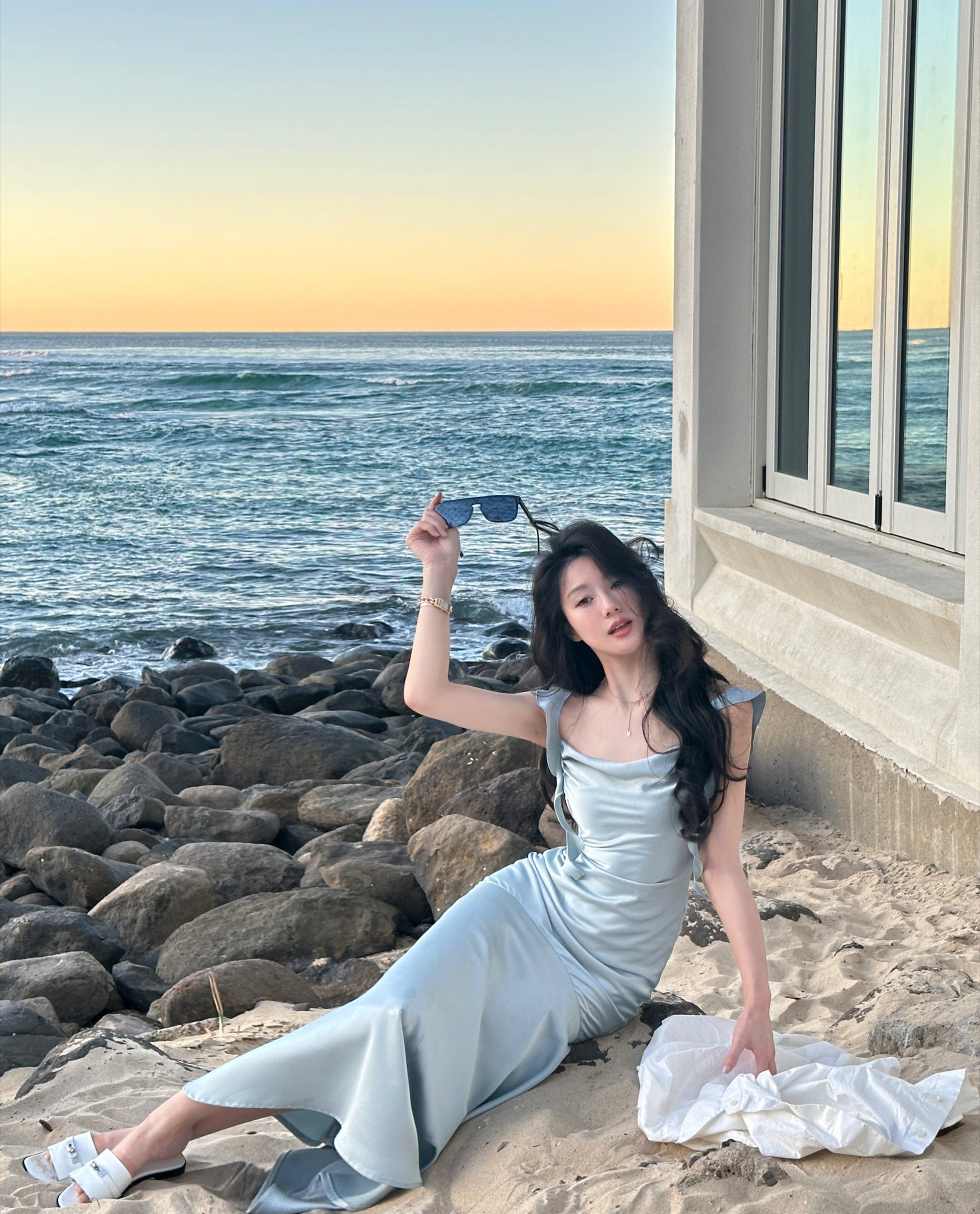 Design Elements: This elegant dress features an off-shoulder design with dainty cap sleeves that gently drape along the arms, accentuating the decolletage. The form-fitting bodice flows into a flared mermaid skirt, creating a classic silhouette.