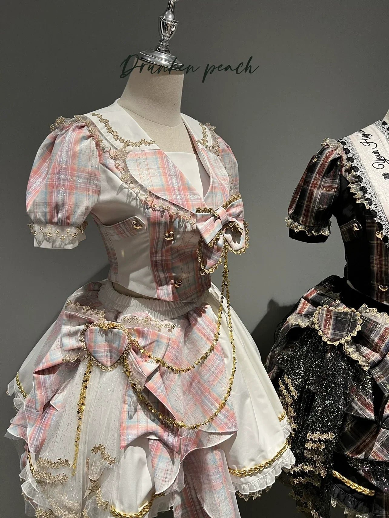 Tartan Melody Idol Lolita Two-Piece Set with Golden Accents Girl Group Inspired Skirt Ensemble